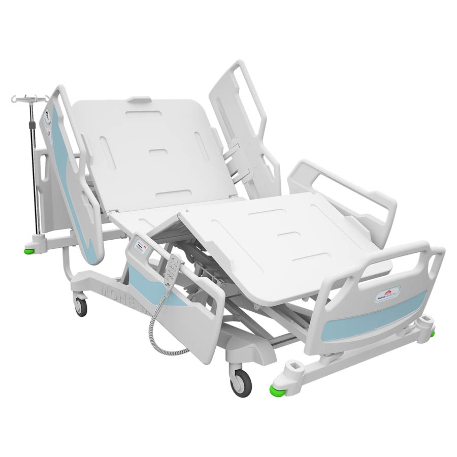 Регулирование высоты кровати, позиций Тренделенбург и обратный Тренделенбург, движения спинки и ножной секции обеспечиваются четырьмя независимыми моторами. При движении спинки кровати, чтобы матрас не собирался, и пациент не ощущал дискомфорта, спинка поднимается, скользя на 12 см. При необходимости, благодаря электроприводу, кровать может принимать позицию Тренделенбург 15 ° и обратный Тренделенбург 15°. Изменение позиции выполняется при помощи управления, легко и безопасно. Для экстренного вмешательства на панели кровати для медсестры имеется электронный CPR и в части спинки имеется ручной CPR (QR - Quick Release), контрольная панель для медсестры, батарея, центральная тормозная система, ручной пульт. Колеса кровати вращаются вокруг своей оси на 360°, имеется центральная тормозная система. По углам кровати имеются буферные колеса против ударов. Все металлические детали кровати покрыты ABS пластмассой. Спинки кровати изготовлены из литого РР-РЕ пластика и могут демонтироваться для очистки. Металлические детали кровати покрыты электростатической порошковой краской, полимеризированной в печи при температуре 200 °С, обеспечивающей защиту от коррозии и воздействия внешних условий.